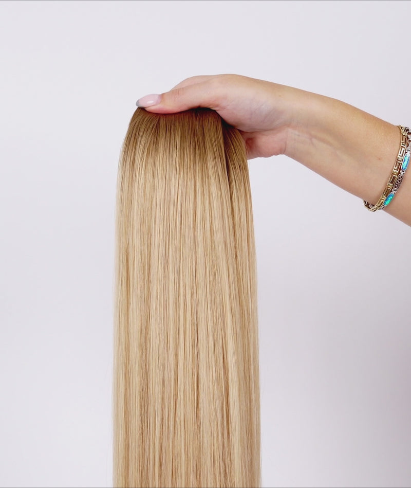 Colour - #Rooted Beach Blonde. A darker root blended into warm, sunlit blonde lengths, designed to replicate naturally lightened hair from root to tip.